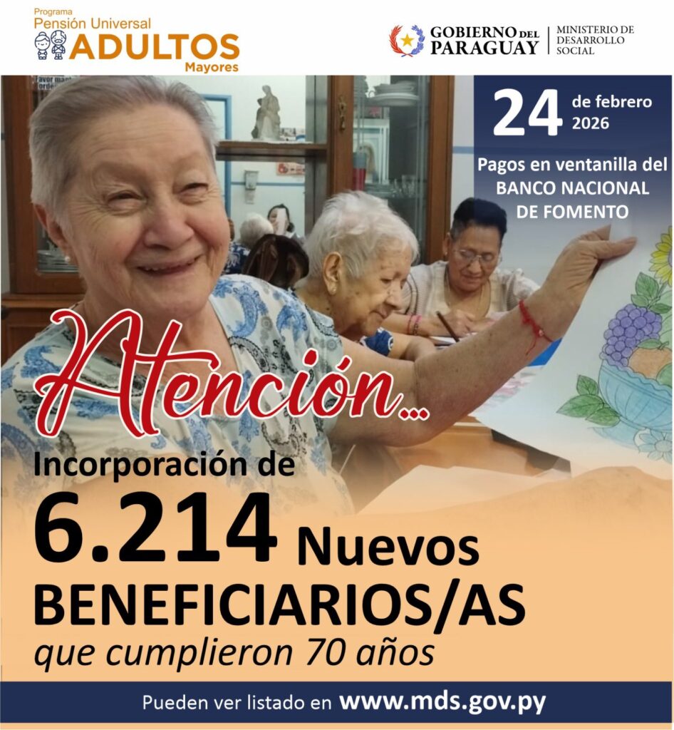 El Gobierno nacional incorporó a 6.214 personas de 70 años al programa de pensión alimentaria para Adultos Mayores. Gracias a esta ampliación, los nuevos beneficiarios podrán cobrar, desde este martes 24 de febrero, un monto de ₲ 724.762 (equivalente al 25 % del salario mínimo) a través de las ventanillas del Banco Nacional de Fomento.