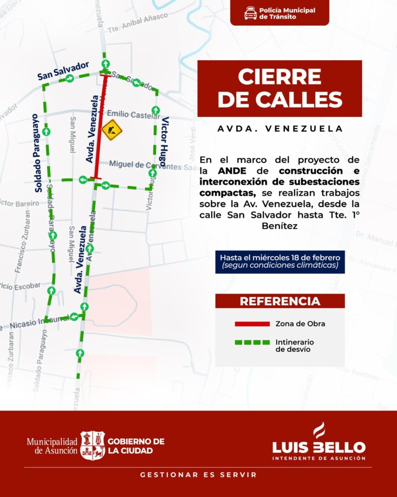 La Municipalidad de Asunción informó que la Avda. Venezuela permanecerá cerrada al tránsito vehicular desde este lunes hasta el miércoles 18 de febrero por obras de la Administración Nacional de Electricidad (ANDE).