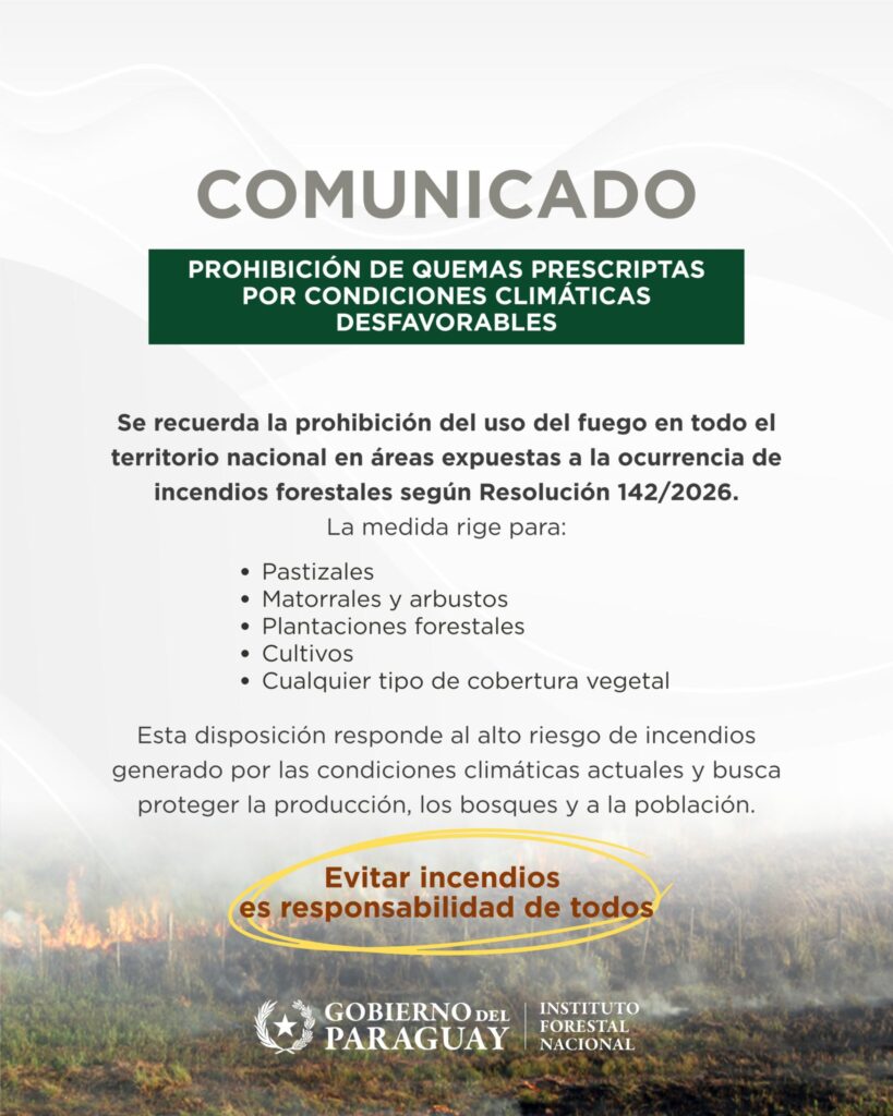 El Instituto Forestal Nacional (Infona) ratificó la prohibición temporal del uso del fuego en todo el territorio paraguayo. La medida, que se oficializó mediante la Resolución 142/2026, responde al elevado peligro de incendios forestales y alcanza a cualquier tipo de quema en superficies con cobertura vegetal.