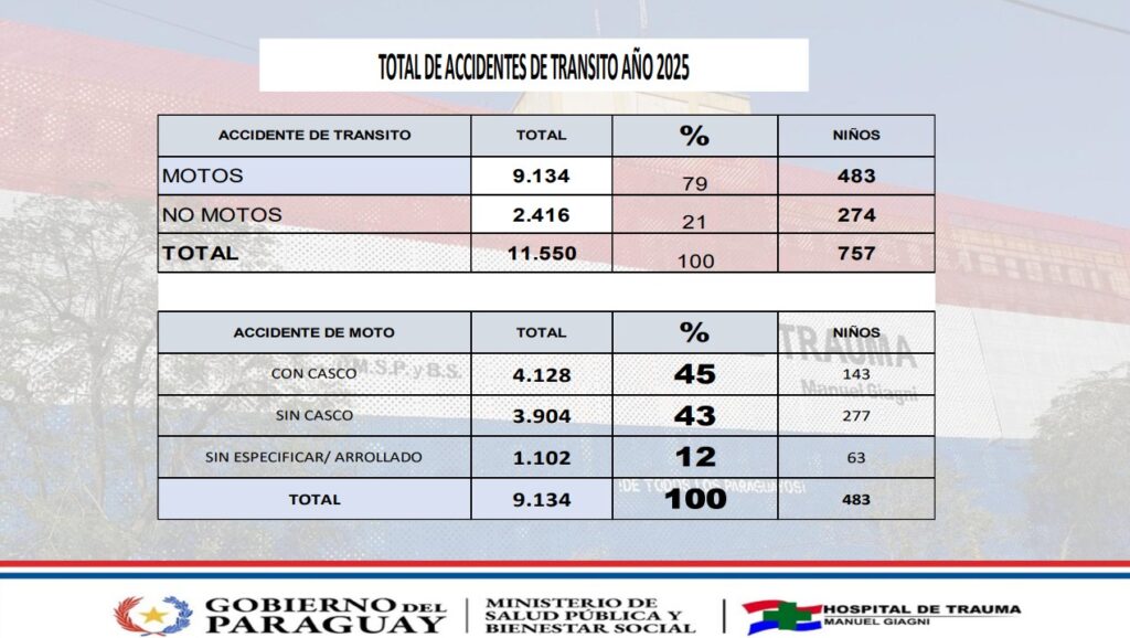 En cuanto a los accidentes de tránsito a lo largo del año, el informe reveló que el 79 % de los casos correspondió a motociclistas. Se contabilizaron 9.134 accidentes en moto, con un saldo de 145 fallecidos.