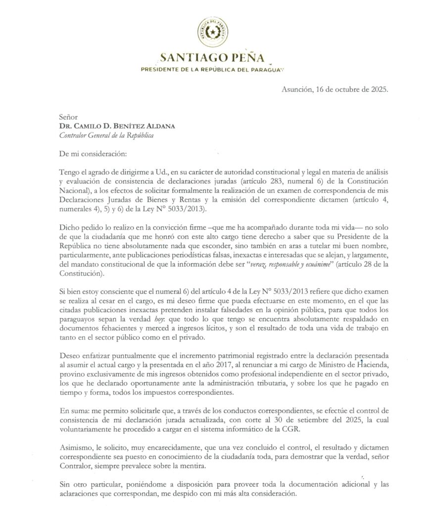 El presidente de la República, Santiago Peña, remitió una nota al contralor Camilo Benítez solicitando una revisión integral de sus declaraciones juradas de bienes, tanto la presentada al inicio de su mandato como la recientemente actualizada.