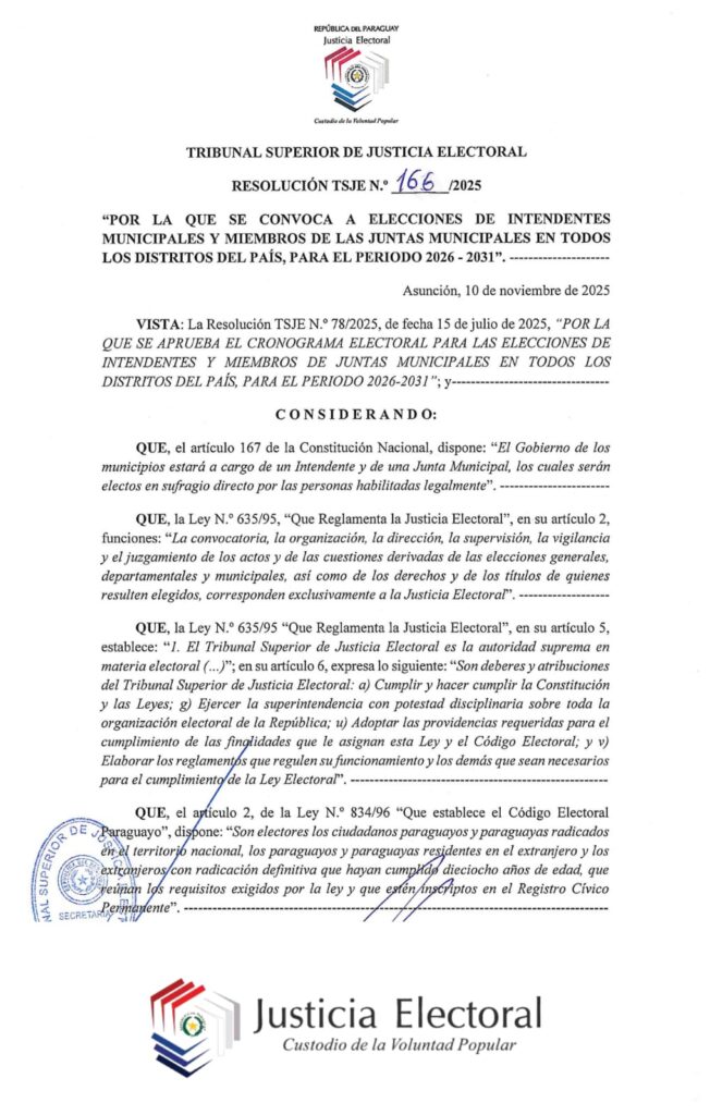 El Tribunal Superior de Justicia Electoral (TSJE) oficializó el llamado a elecciones para renovar intendentes y miembros de Juntas Municipales en los diferentes distritos del Paraguay para el periodo 2026–2031.